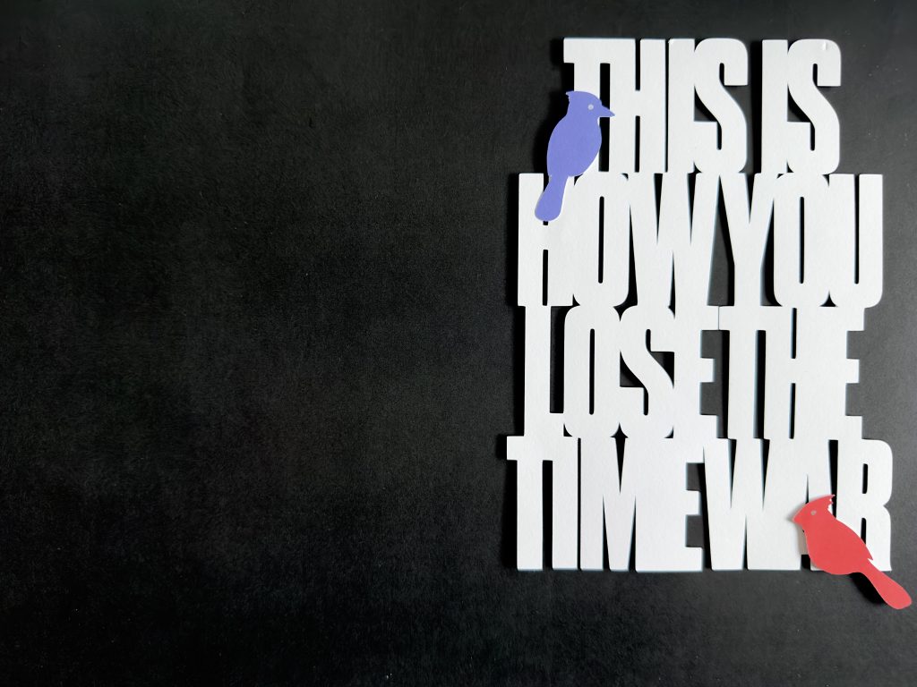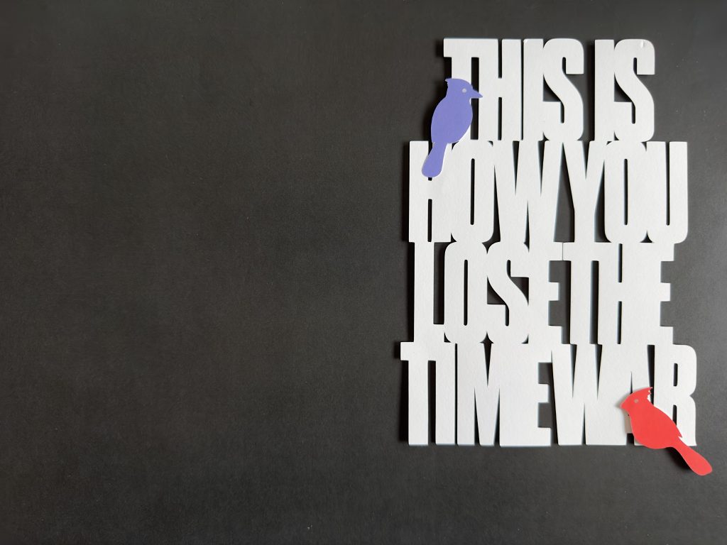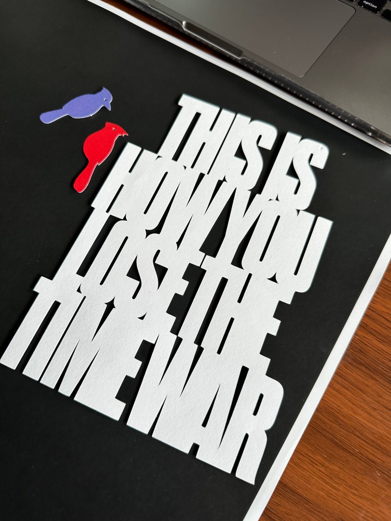 The cover for This Is How You Lose The Time War was created through photography. The title itself is one sheet cut out to form the letters, and the small birds that represent the two main characters are also paper. They had to be lifted a few inches off of each other and the background to create shadows.